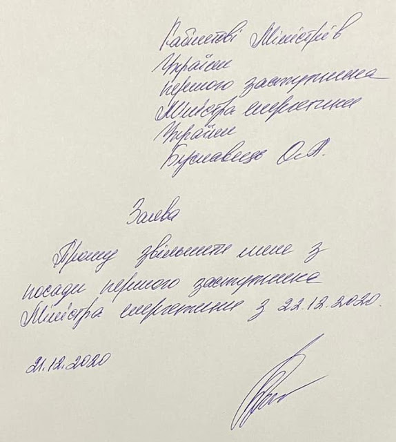 Про це Ольга Буславець повідомила у Facebook, опублікувавши фото своєї заяви, пише Енергетичний фронт.