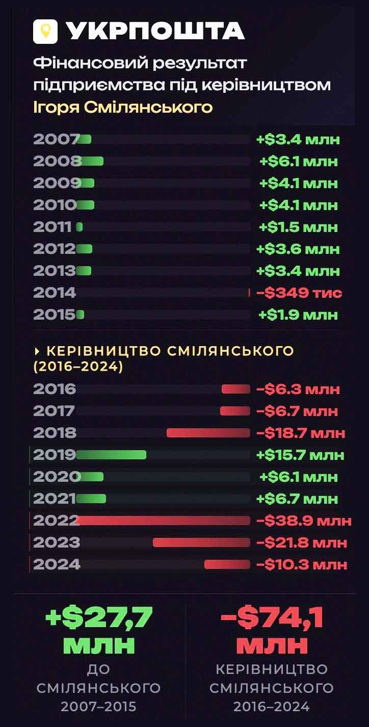 “Укрпошта” за 9 років до Смілянського отримала $28 млн прибутку, а за 9 років його керівництва — $74 млн збитків